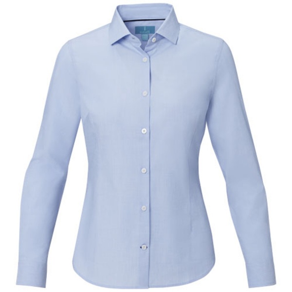 Udržitelné propagační oděvy. Polootevřený límeček. Gravírované perleťové knoflíčky. Nastavitelná manžeta s jednoduchým záhybem. Saténové lemování na vnitřní straně výstřihu. Kontrastní prošití na manžetách rukávů a spodní knoflíkové léze. Tkaný štítek.
