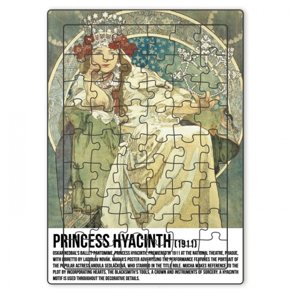 Puzzle vo formáte A4 s obrazom Princezná maliara Alfonsa Muchu. Puzzle obsahuje 54 dielikov.