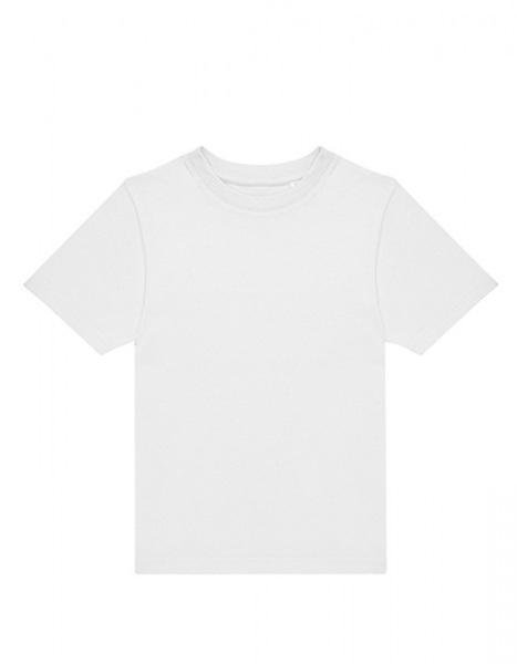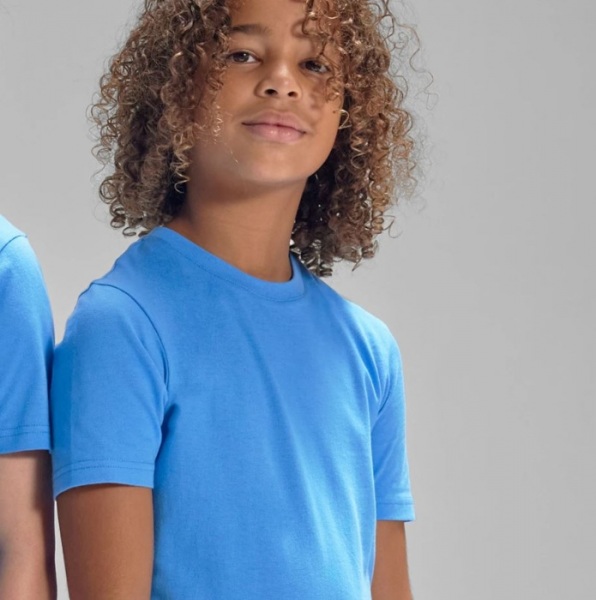 100 % predzrážaná, prstencovo pradená bavlna | Jednoduchý džersej | Strih bez bočných švov (veľkosť 1/2 s bočnými švami) | Úzky rebrovaný golier | Výstužná páska za krkom vzadu | Bez štítku