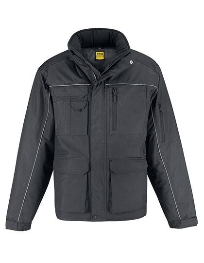 Vonkajšia vrstva: 100% polyester Rip-stop, vodotesný (5000 mm), vetruodolný (230 g / m?) | Vnútorná vrstva: silná tepelne izolovaná podšívka (200 g / m?) pre väčšie teplo | Vysoko funkčná ťažká bunda PRO s ergonomickou skrytú kapucňou | 12 multifunkčných