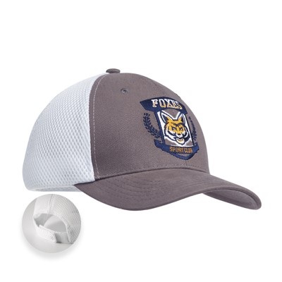 6 panel medium profile trucker hat. Heavy cotton front with sport mesh back. Pre-curved single-colour visor, polyester sweatband and hook and loop closure.