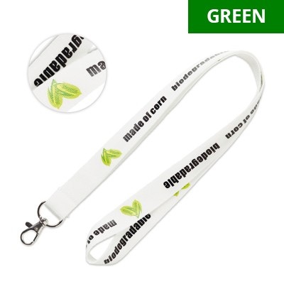 MOQ 100 pcs. 1 colour silkscreen on 1 side included. Made of corn, same colour on both sides, with metal hook. Size 45x2cm. Add the optional antibacterial treatment (ISO 20743) to the corn ribbon.