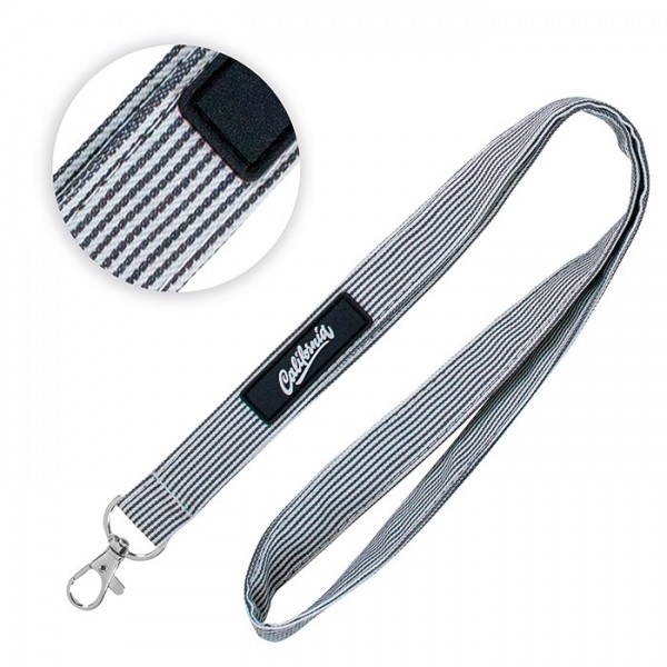 MOQ 100 pcs. A 2 colour PVC badge is included. 100% cotton in standard colour and striped pattern with a PVC badge (own PMS) on 1 position. With metal hook. Size: 45x2cm. Add the optional antibacterial treatment (ISO 20743) to the cotton ribbon