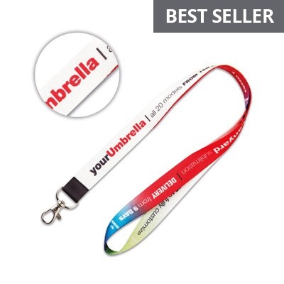 MOQ 100 pcs. Sublimation on both sides included. Fine polyester, with metal hook. Size 45x2cm. Add the optional antibacterial treatment (ISO 20743) to the polyester ribbon.