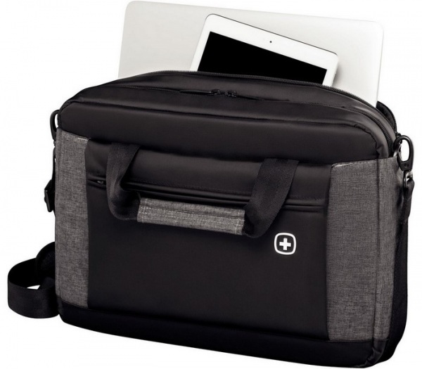 Vystužená taška na notebook 16" / 41 cm s vreckom na tablet/eReader. Odnímateľný ramenný popruh, duálne rukoväte, popruh pre pripevnenie na kovové držadlo cestovného kufra.