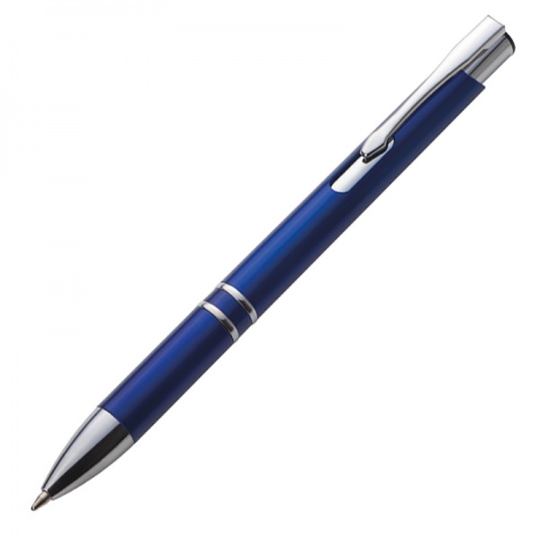 Plastové guľôčkové pero so striebornými časťami. Pero má modrý atrament.