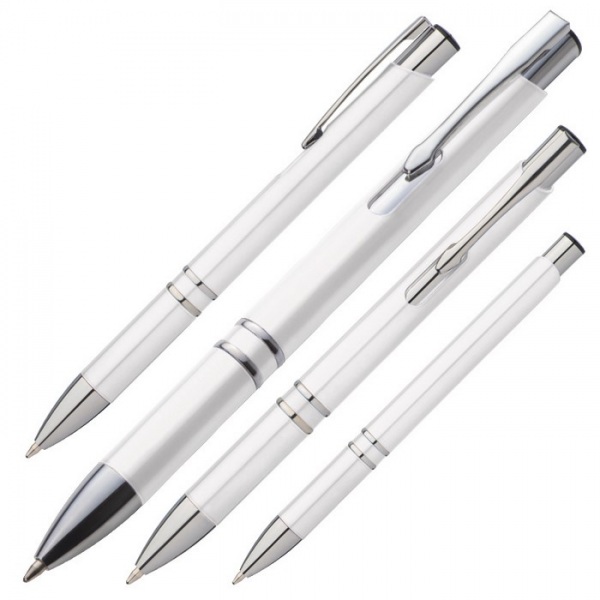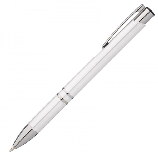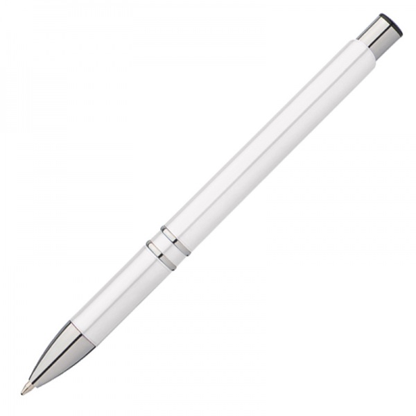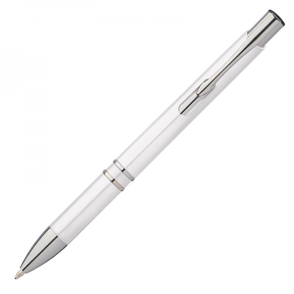 Plastové guľôčkové pero so striebornými časťami. Pero má modrý atrament.