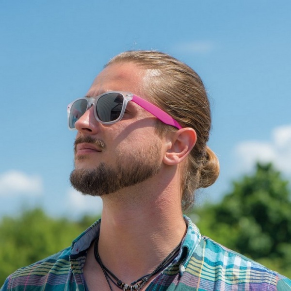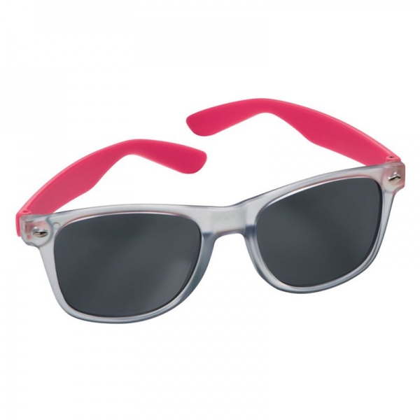 Slnečné okuliare s transparentným rámom a farebnými ramienkami a UV400 ochranou.