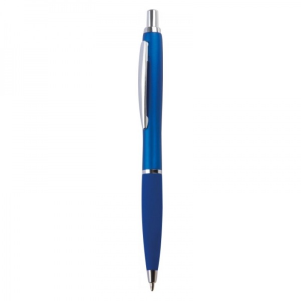 Tenké plastové guľôčkové pero s gumovou rukoväťou. Pero má modrý atrament.