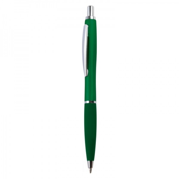 Tenké plastové guľôčkové pero s gumovou rukoväťou. Pero má modrý atrament.