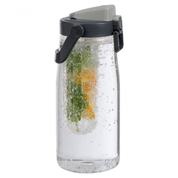 Veľký džbán z plastu s uzamykateľným otvorom, rukoväťou na prenášanie, sitkovou vložkou napr. na ovocie a objemom 2500 ml.