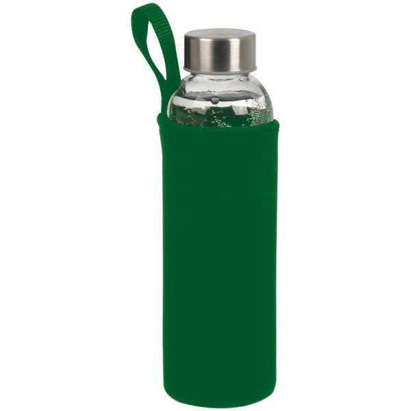 Sklenená fľaša s kovovým vrchnákom, objemom 500 ml v neoprénovom puzdre a s pútkom na zápästie. Jednotlivo balené v papierovej krabičke.