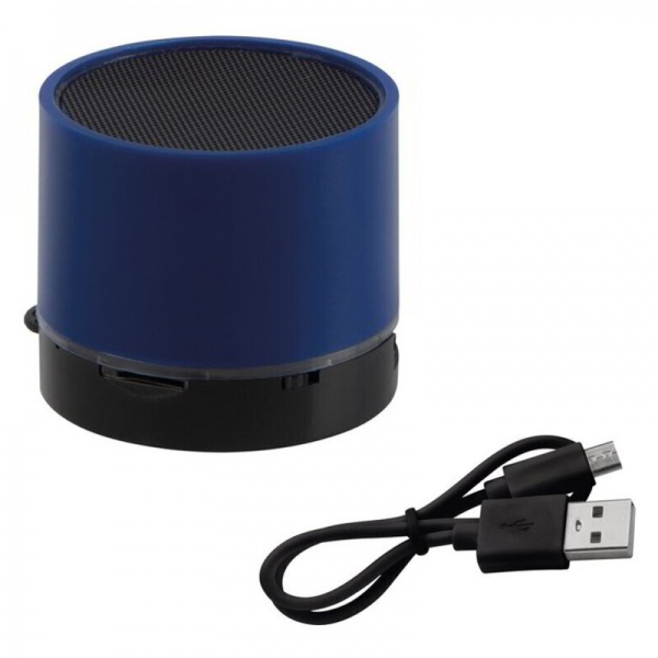 Bluetooth reproduktor s kovovým vzhľadom a tenkým LED svetlom dookola, ktoré svieti počas prehrávania.