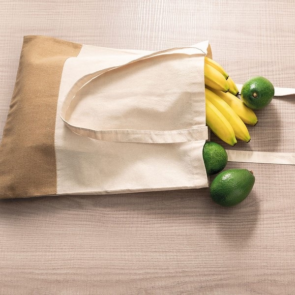 100% Bavlnená taška (160 g/m2) s detailmi z imitácie juty a 65cm dlhým uchom.
