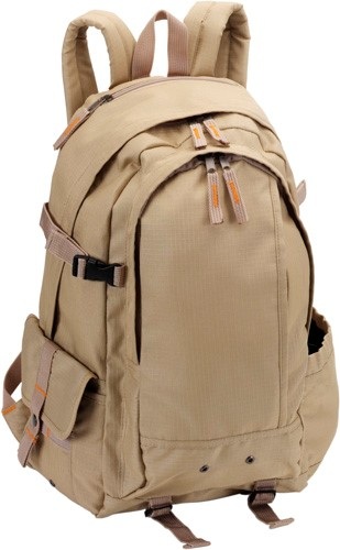 Ruksak z 210D polyesteru s dvoma priečinkami na zips a dvoma bočnými vreckami.