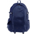 Ruksak z 210D polyesteru s dvoma priečinkami na zips a dvoma bočnými vreckami.