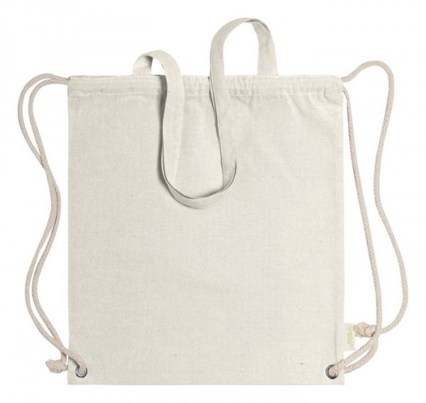 Vak z recyklovanej bavlny na sťahovanie silnými pletenými šnúrami, s dlhými uškami. Dá sa tiež použiť ako nákupná taška. 100% recyklovaná bavlna, 140 g/m2.