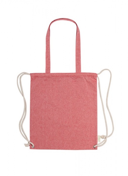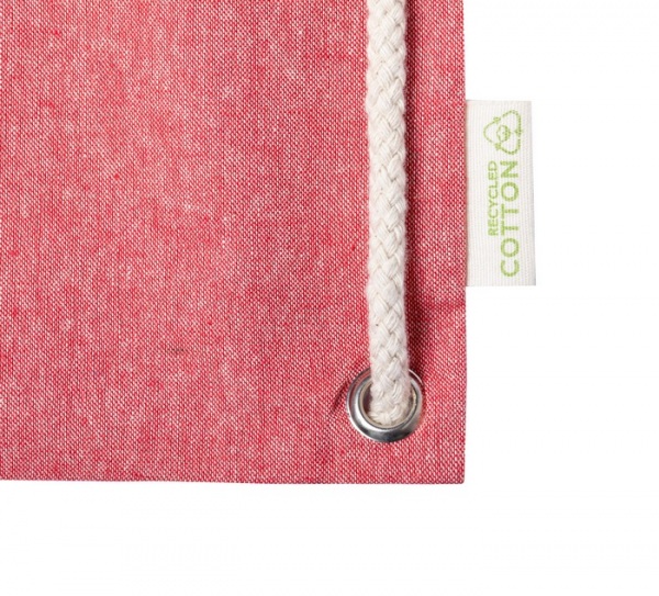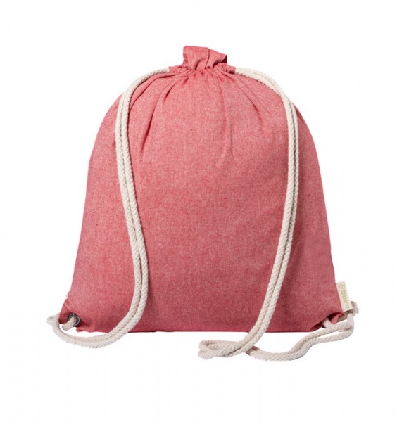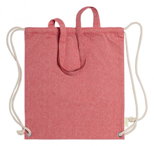 Vak z recyklovanej bavlny na sťahovanie silnými pletenými šnúrami, s dlhými uškami. Dá sa tiež použiť ako nákupná taška. 100% recyklovaná bavlna, 140 g/m2.