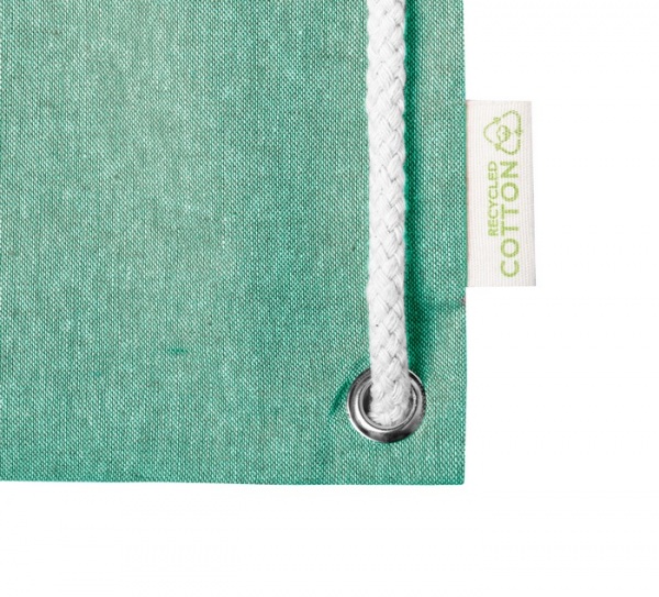 Vak z recyklovanej bavlny na sťahovanie silnými pletenými šnúrami, s dlhými uškami. Dá sa tiež použiť ako nákupná taška. 100% recyklovaná bavlna, 140 g/m2.