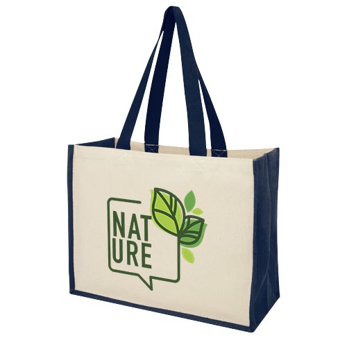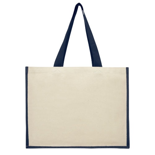 Plátenná a jutová taška s objemom 23 litrov. Kombinácia plátna s gramážou 320 g/m2 a juty s gramážou 330 g/m2, nosnosť až do 12 kg. Vyrobené v Indii s certifikátom OEKO-Tex.