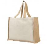 Plátenná a jutová taška s objemom 23 litrov. Kombinácia plátna s gramážou 320 g/m2 a juty s gramážou 330 g/m2, nosnosť až do 12 kg. Vyrobené v Indii s certifikátom OEKO-Tex.