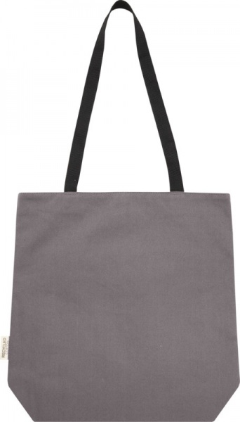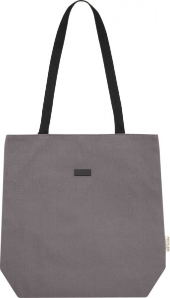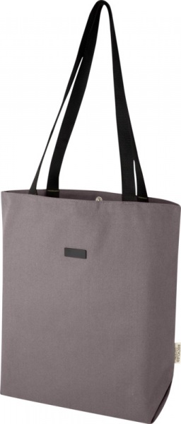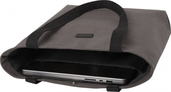 Nákupná taška z GRS certifikovaného recyklovaného plátna a GRS certifikovanej RPET podšívky. Polstrovaná priehradka na 15" notebook a 2 vnútorné vrecká, ľahké zapínanie na gombík a pohodlné bavlnené rukoväte. Dekoratívna kovová doska na logo.