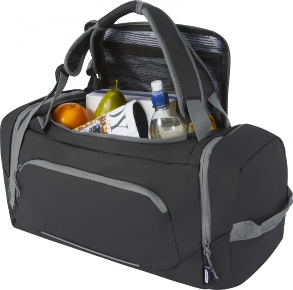 Má priestrannú hlavnú priehradku s otvorom v tvare U pre ľahké skladovanie a prístup, 2 bočné vrecká na zips (vrátane priehradky na topánky), predné vrecko na zips, sieťované vrecko na fľašu a reflexné lemovanie. Objem 35 litrov. Bez PVC.