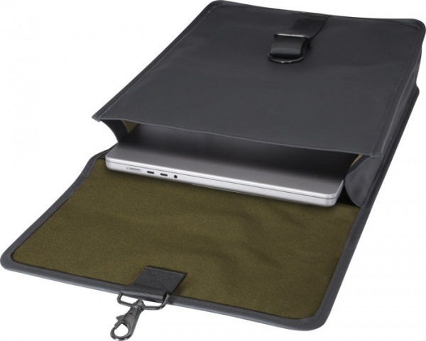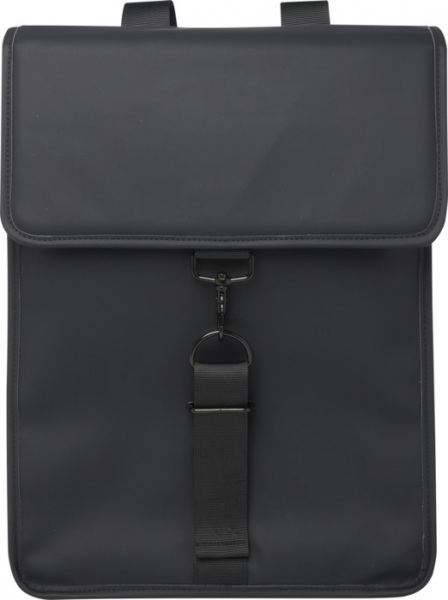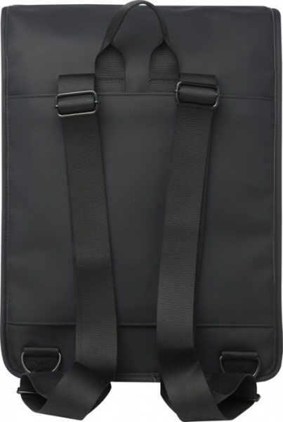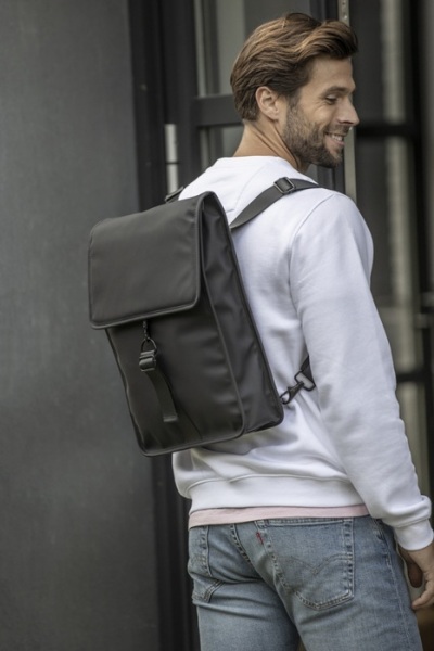 Batoh z odolných a udržateľných materiálov. Vonkajšia strana z 51% GRS recyklovaného PU plastu a podšívka zo 100% GRS recyklovaného RPET. Batoh má polstrovanú priehradku na 15,6" notebook, pútko na fľašu a vrecko na zips.