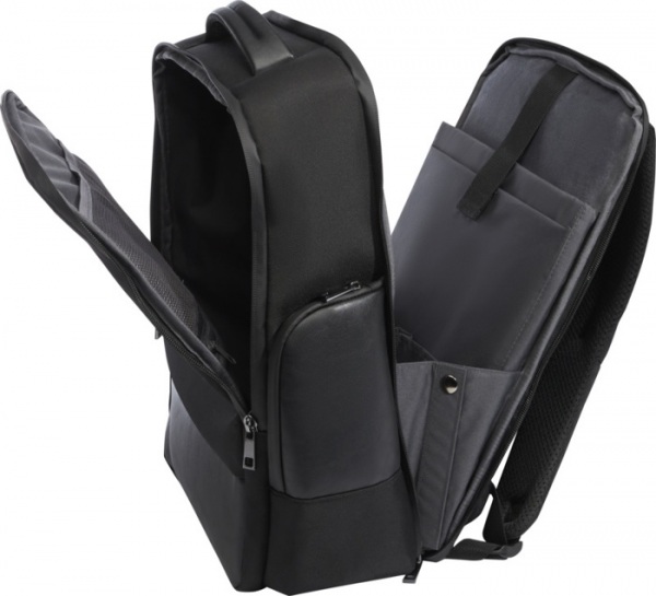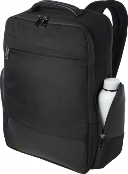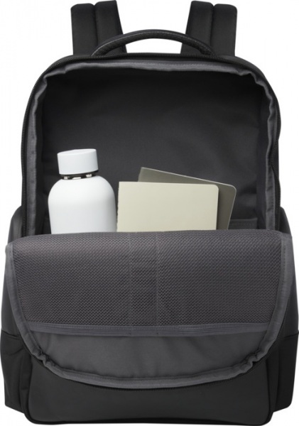 Batoh GRS z vodoodpudivého 900D RPET s PU prvkami a RPET podšívkou. Priehradka na 15,6" notebook a tablet, hlavná priehradka s nepriepustným vreckom na toaletné potreby, organizačné vrecká, predné vrecko na zips a skryté vrecko. Objem: 25 l. Bez PVC.