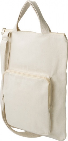 Bavlnená (340 g/m2) taška na notebook 15". Jedna veľká priehradka na zips, malé predné vrecko na zips. Dve krátke rukoväte a jeden nastaviteľný ramenný popruh.