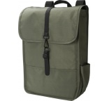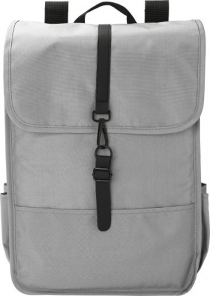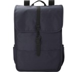 Ruksak z RPET polyesteru (300D). Dve bočné vrecká na fľaše. Jedna veľká priehradka pod klopou. S čiernym PU remienkom a zatváraním na karabínku.