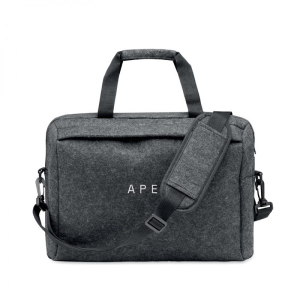 RPET taška na 15palcový notebook vrátane jednej hlavnej vnútornej priehradky a jedného predného vrecka na zips. Nastaviteľný ramenný popruh. Držiak na kufrík na zadnej strane.