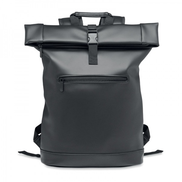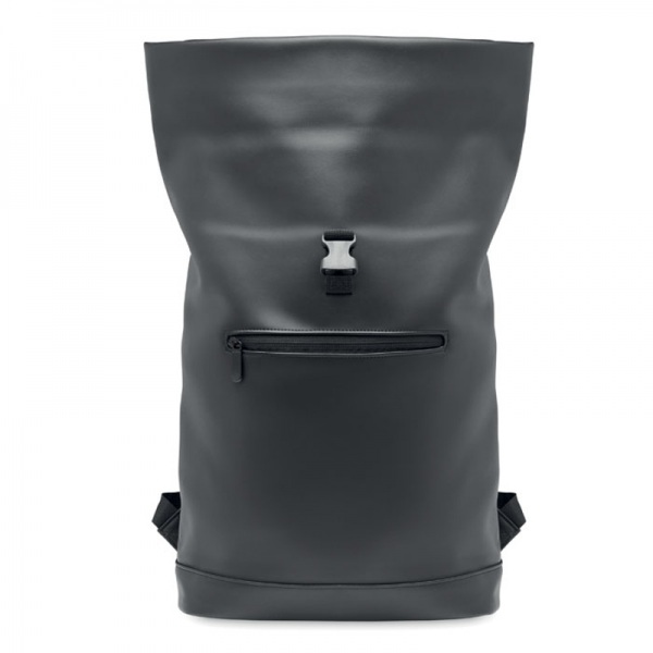 Rolovací batoh na 15' notebook z mäkkého PU s polstrovaným chrbtom a vystuženým dnom. Veľké predné vrecko na zips. Podšívka je z materiálu 210D RPET.