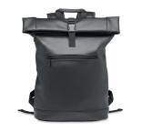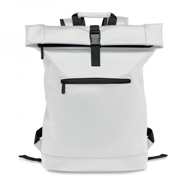 Rolovací batoh na 15' notebook z mäkkého PU s polstrovaným chrbtom a vystuženým dnom. Veľké predné vrecko na zips. Podšívka je z materiálu 210D RPET.