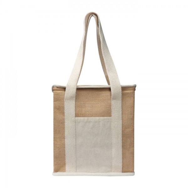 Chladiaca taška vyrobená z laminovanej juty odolnej voči vlhkosti s vnútornou izoláciou z hliníka so zapínaním na zips a extra výškou, vhodná pre 6 x 500 ml fľaše.