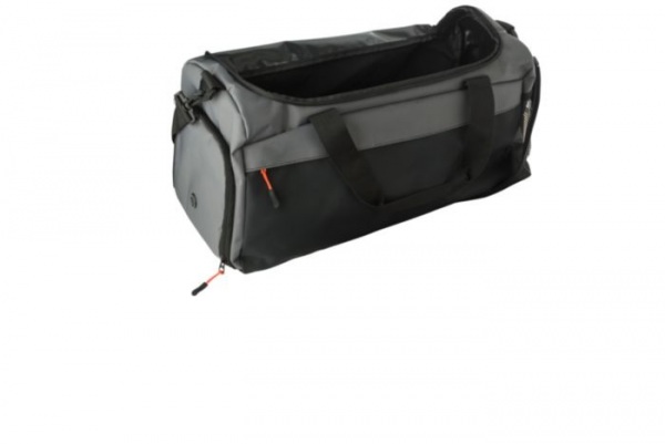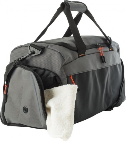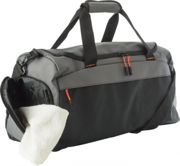 Dvojfarebná taška s predným vreckom na zips. Vetraná bočná priehradka na topánky, sieťované vrecko na opačnej strane. Krátke rukoväte so suchým zipsom na zatváranie. Veľká hlavná priehradka s vystuženým dnom.
