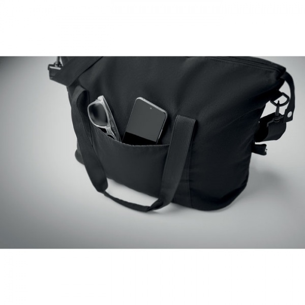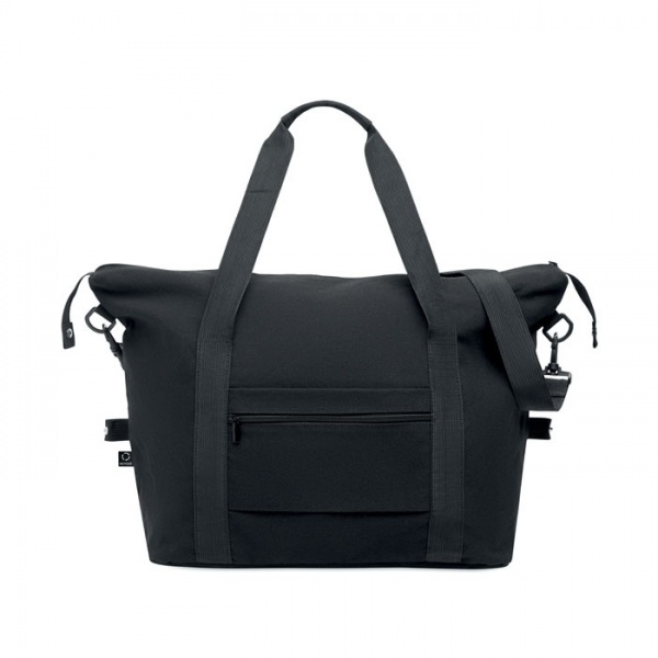 Víkendová taška z recyklovanej predspotrebiteľskej bavlny a recyklovaného polyesteru s podšívkou z 210D RPET polyesteru. Má predné vrecko na zips, zadné vrecko na zips, odnímateľný a nastaviteľný ramenný popruh a polstrované dno. Držiak na kufor.