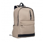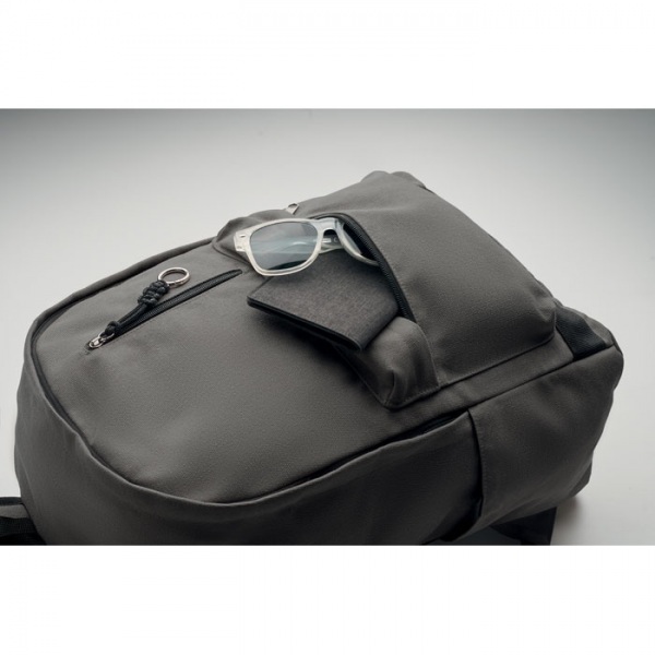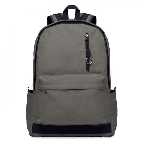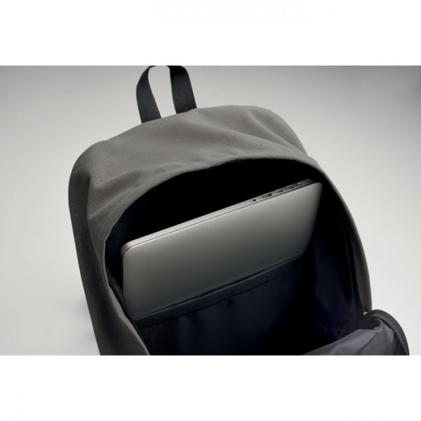 Batoh na 15-palcový notebook z recyklovaného praného plátna. Veľké predné vrecko na zips s vnútornou priehradkou na notebook. Malé predné vrecko na zips. Dve bočné vrecká. Polstrovaný chrbát a ramenné popruhy, chrbtový panel a základňa.
