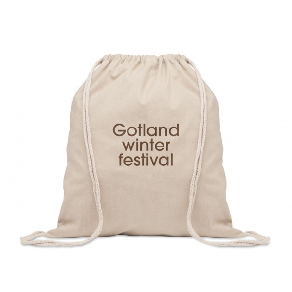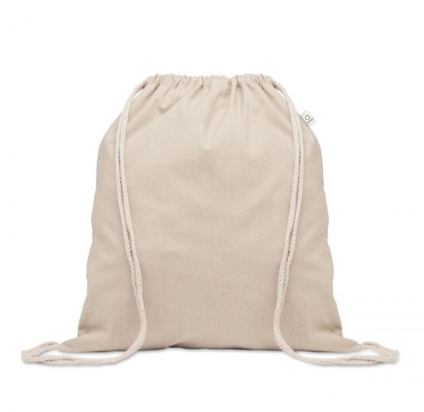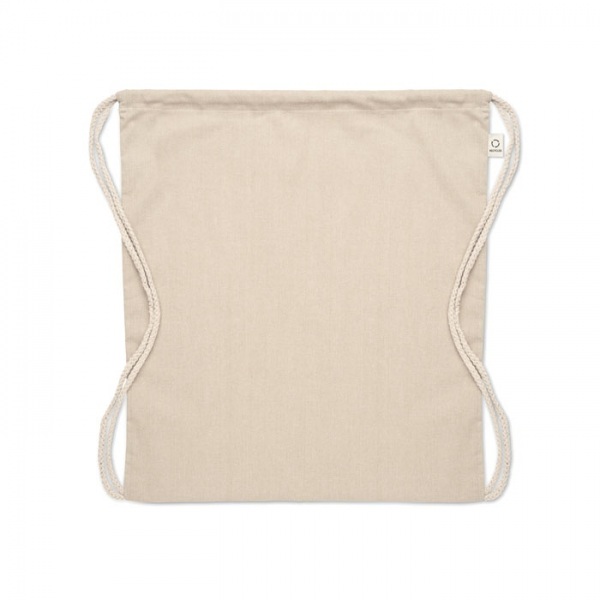 Sťahovacie vrecúško z recyklovanej predspotrebiteľskej bavlny (70%) a RPET (30%). Gramáž 140 g/m2. Táto položka sa môže po potlači zmenšiť.