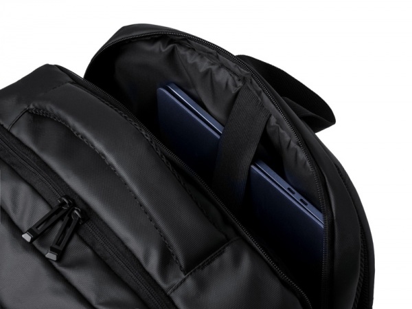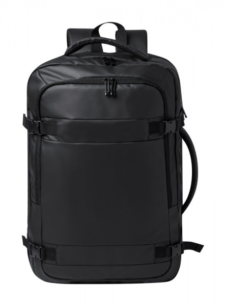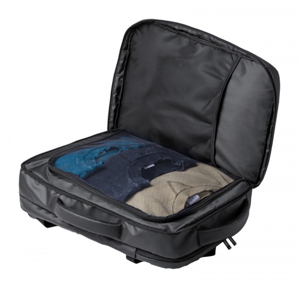 Batoh z PU kože s priehradkami na zips, polstrovanou priehradkou na notebook (17") a sieťovanou priehradkou, popruhom na vozík, polstrovaným chrbtom a ramennými popruhmi.