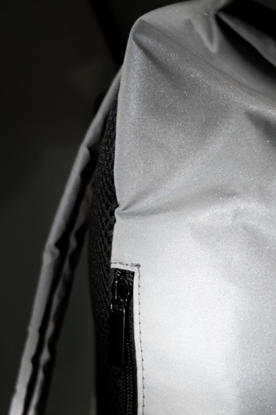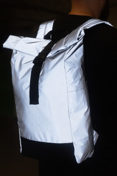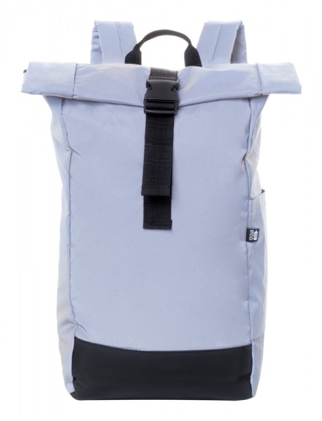 Reflexný rolovací batoh so zapínaním na pracku, hlavný oddiel, skryté vrecko na zips, polstrovaná priehradka na notebook (15"), bočné vrecko, polstrovaný chrbát a ramenné popruhy. S výrazným štítkom RPET. Len na propagačné účely.