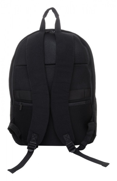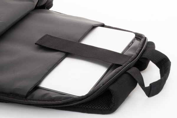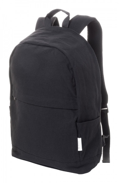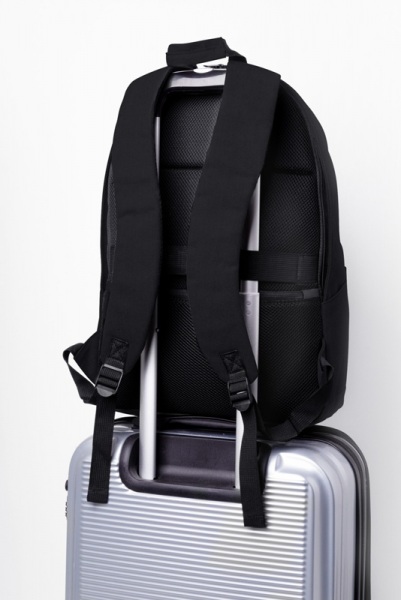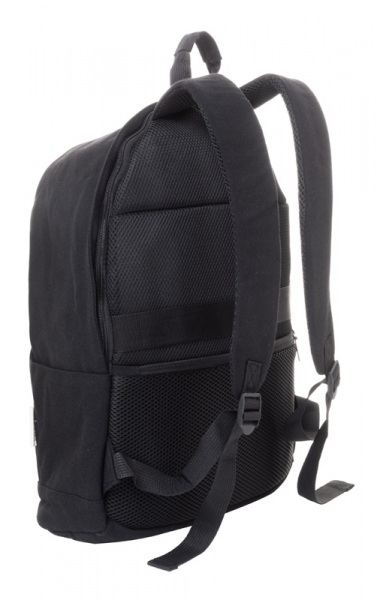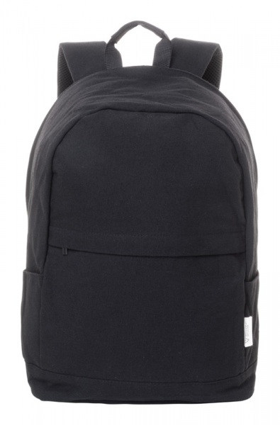 Batoh z recyklovaného plátna s hlavným oddielom na zips, polstrovanou priehradkou na notebook (15"), predným vreckom na zips, bočnými vreckami, popruhom na vozík, polstrovaným chrbtom a ramennými popruhmi. So skrytým vreckom proti krádeži.