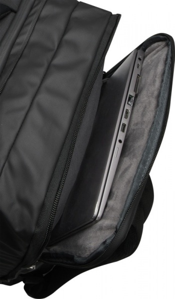 Vodoodpudivý materiál, priehradka na 17" notebook a tablet, rozšíriteľný oddiel na oblečenie, nepriepustné vrecko na toaletné potreby a predná priehradka. Polstrované a nastaviteľné popruhy, vrecko na kartu, pútko na okuliare a polstrovaná rukoväť.