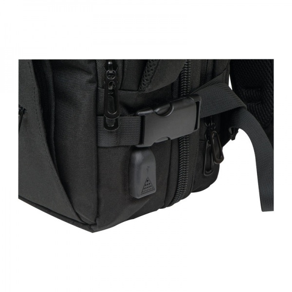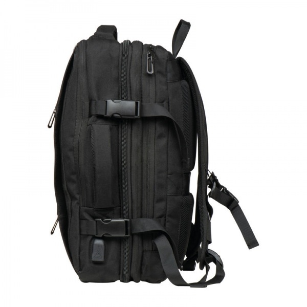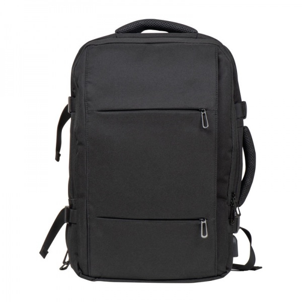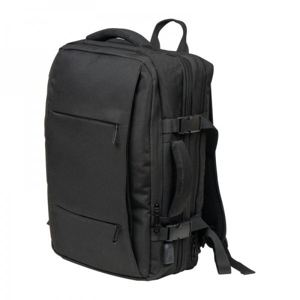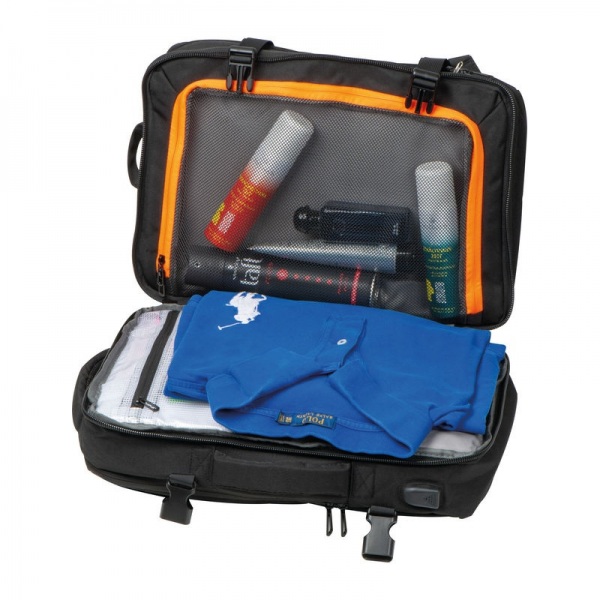 Cestovný batoh s 3 priehradkami na zips. Priehradka na notebook, menšie priehradk, integrovaná priehradka na mokré veci a na uskladnenie kozmetiky. Objem batohu je od 22l do 37l, nastaviteľný pomocou upevňovacích popruhov.