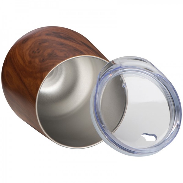 Nerezový pohár s dreveným výzorom a plastovým vrchnákom. Kapacita 380 ml.