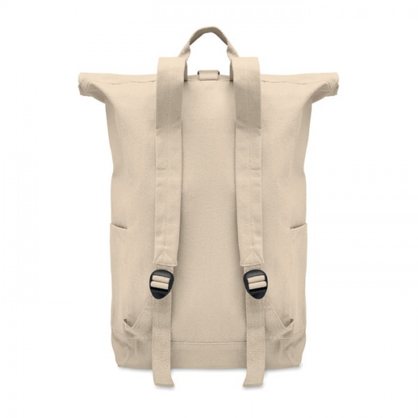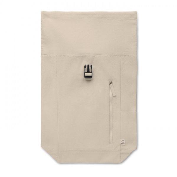 Batoh s rolovacím vrchom a zapínaním na suchý zips z 390 g/m2 recyklovanej bavlny (80 %) a recyklovaného polyesteru (20 %). Predné vrecko na zips.