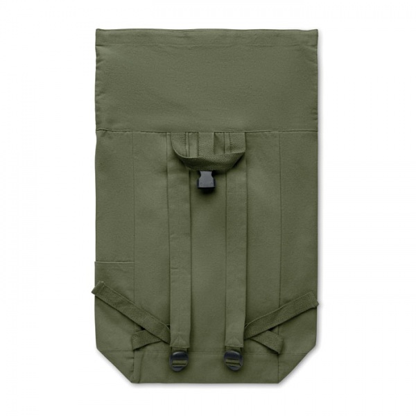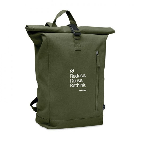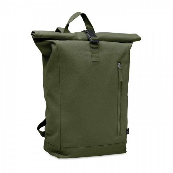 Batoh s rolovacím vrchom a zapínaním na suchý zips z 390 g/m2 recyklovanej bavlny (80 %) a recyklovaného polyesteru (20 %). Predné vrecko na zips.
