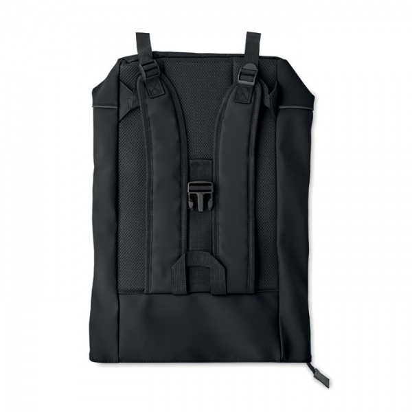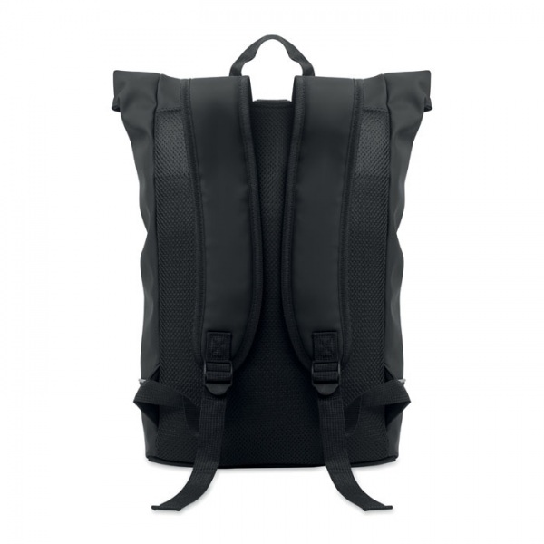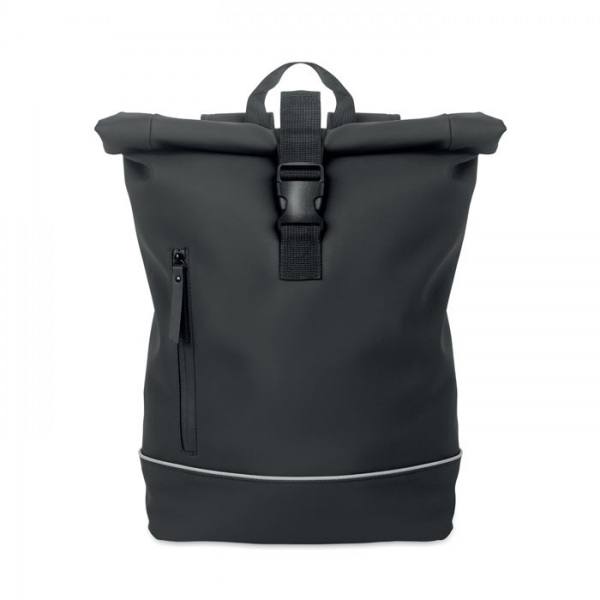 15-palcový batoh na notebook s rolovacím vrchom z mäkkého PU s polstrovaným chrbtom a výstužou dna s reflexným pásikom. Vodeodolné predné vrecko na zips. Podšívka z 210D RPET polyesteru.