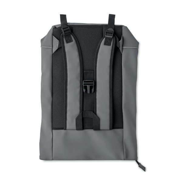 15-palcový batoh na notebook s rolovacím vrchom z mäkkého PU s polstrovaným chrbtom a výstužou dna s reflexným pásikom. Vodeodolné predné vrecko na zips. Podšívka z 210D RPET polyesteru.