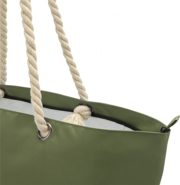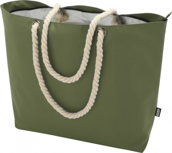 Chladiaca taška Panama z recyklovaného polyesteru s certifikáciou GRS má veľkú hlavnú priehradku na zips, vnútro z vysoko kvalitnej hliníkovej fólie a bavlnené šnúry. Objemová kapacita: 23 litrov. Nosnosť do 10 kg. Neobsahuje PVC.
